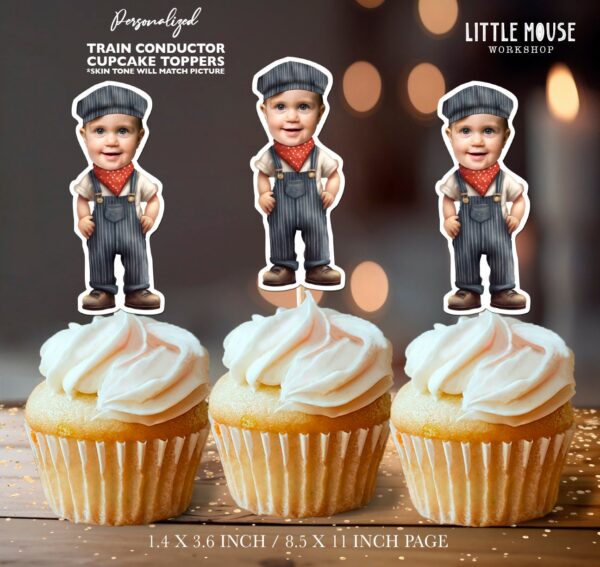 Personalized Photo Train Conductor 1st Birthday Cupcake Toppers