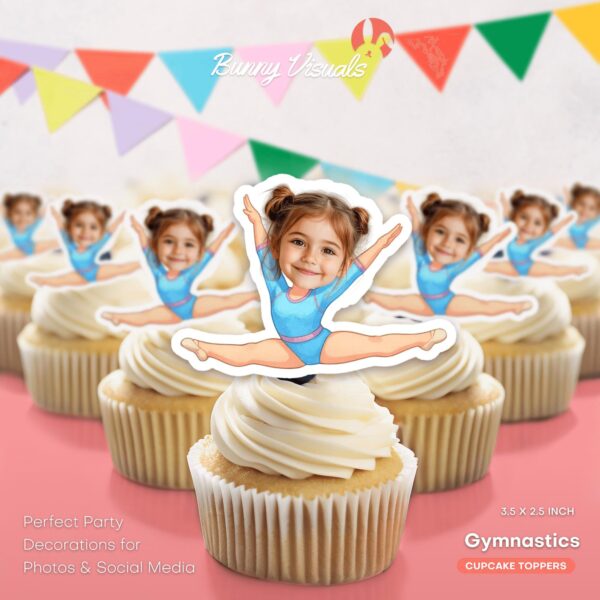 Personalized Face Gymnastics Theme Cupcake Toppers - Blue Leotard Split Jump Design