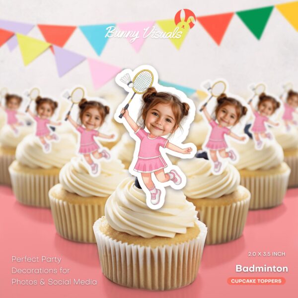 Personalized Badminton Girl Custom Face Cupcake Toppers for Sports Birthday Parties