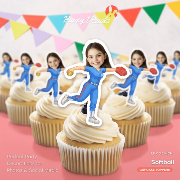 Custom Face Softball Pitcher Cupcake Toppers – Blue Uniform Sports Theme Party Decor