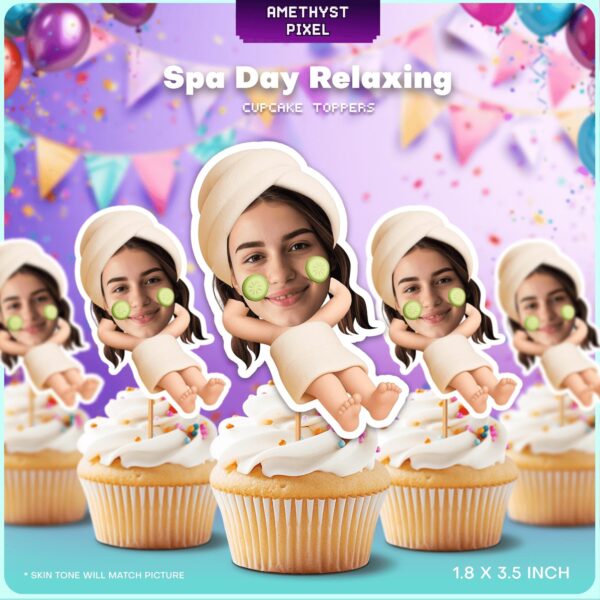 Personalized Spa Day Theme Custom Face Cupcake Toppers with Cucumber Mask Design