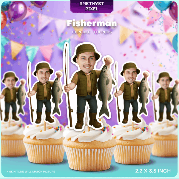 Custom Fisherman Photo Cupcake Toppers for Angler Birthday Parties