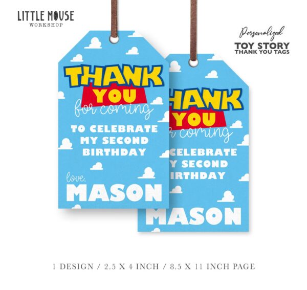 Personalized Toy Story Inspired Thank You Tags – Custom Blue Cloud Favor Labels for 2nd Birthday