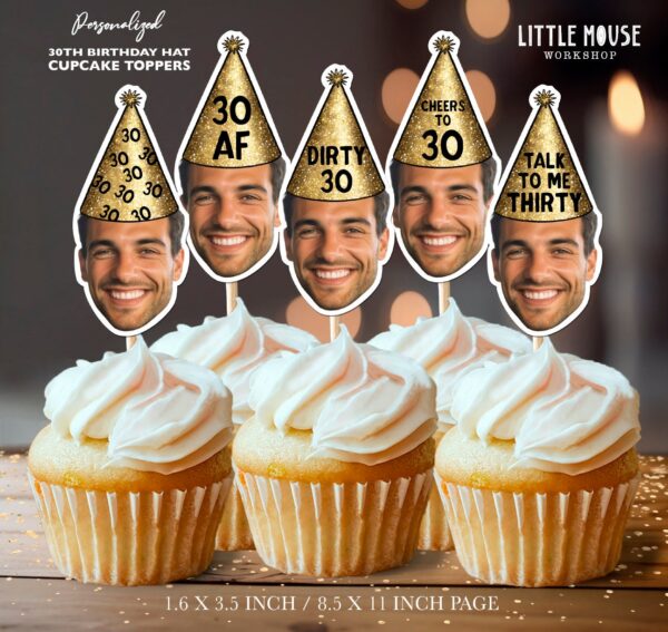 Custom Face 30th Birthday Cupcake Toppers with Gold Glitter Party Hats - Dirty 30 Decor