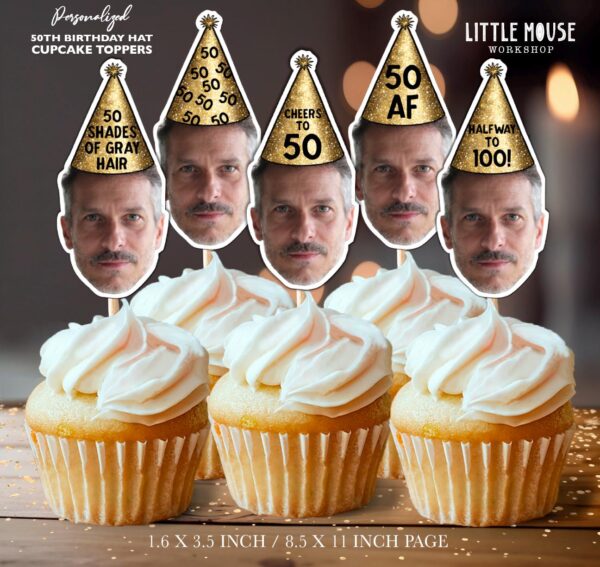 Custom Face 50th Birthday Milestone Cupcake Toppers with Funny Gold Hats