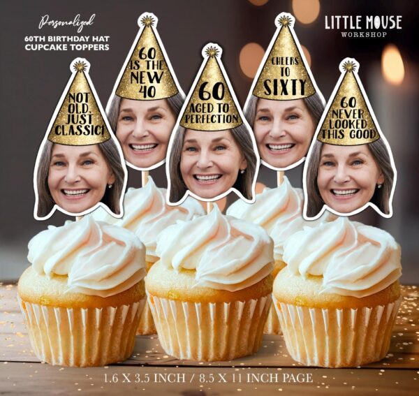 Custom Face 60th Birthday Gold Glitter Party Hat Cupcake Toppers