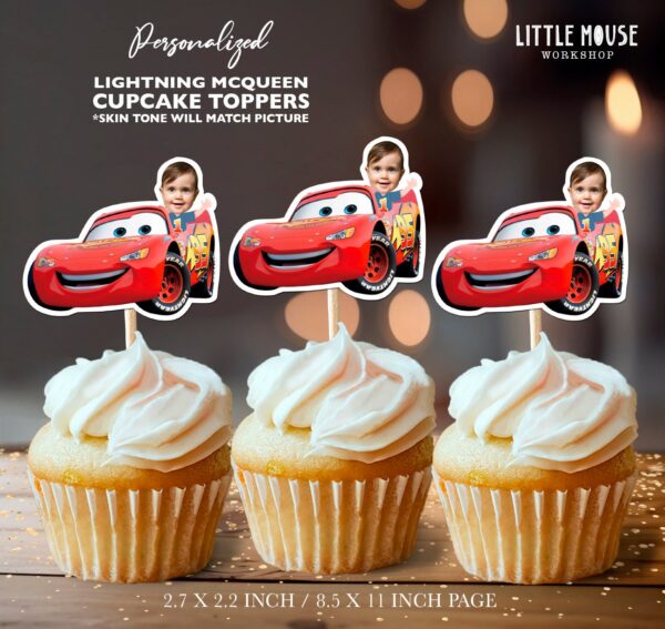 Custom Face Lightning McQueen Cupcake Toppers – Personalized Racing Car Themed Decor