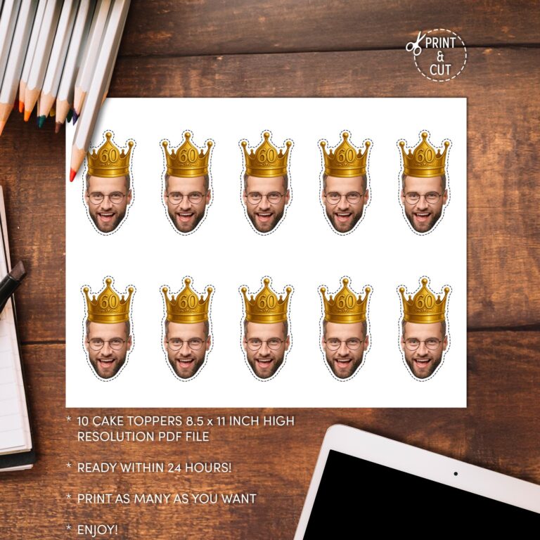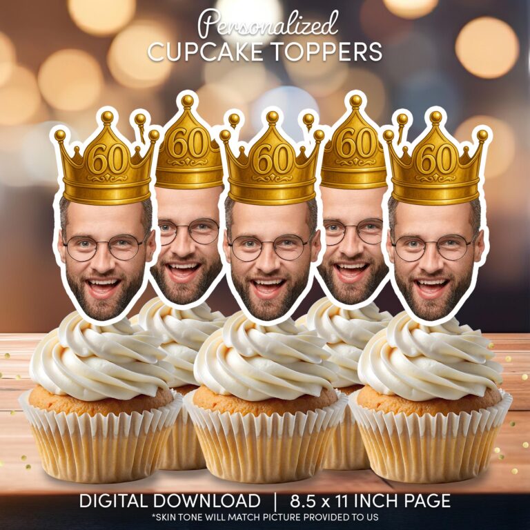 Celebrate the big Six-Zero in style with these hilarious and regal custom face cupcake toppers, designed specifically for a milestone 60th birthday. This digital download transforms the guest of honor into party royalty using a realistic golden crown design emblazoned with the number 60. Ideal for adult birthday celebrations—especially for a husband, dad, or grandfather—these personalized photo toppers create an instant conversation starter at the dessert table. Simply provide a clear photo to receive a high-quality printable file, then print, cut, and assemble at home for a memorable DIY decoration that highlights the birthday VIP.