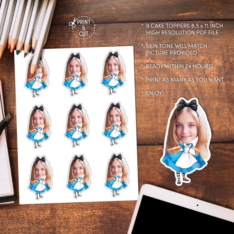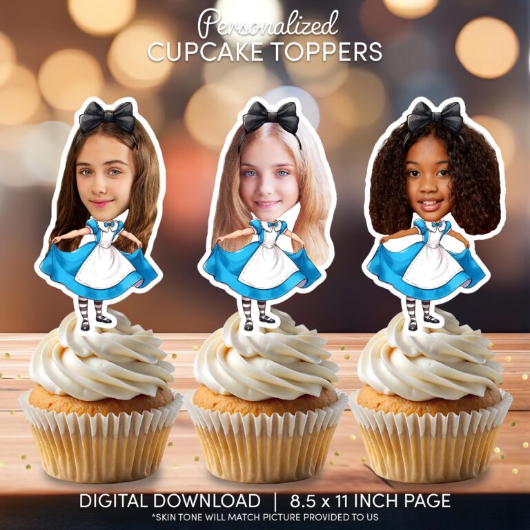 Custom Face Alice in Wonderland Cupcake Toppers – Personalized Photo Decor for Girls
