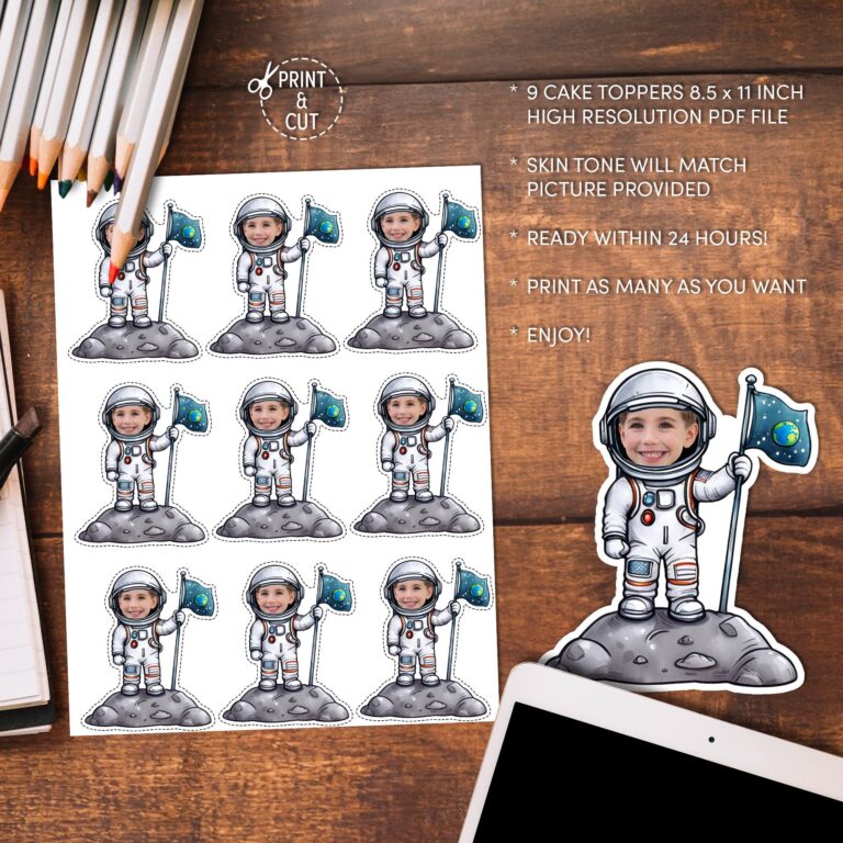Launch your party planning into orbit with these fun, custom astronaut cupcake toppers that feature your child's face right inside the space helmet. Perfect for adventurous themes like "First Trip Around the Sun," "Two the Moon," or a general outer space birthday, this design puts the guest of honor directly on the lunar surface. The artwork showcases a detailed white spacesuit standing on moon rocks while holding a planetary flag, creating a charming focal point for your dessert table. As a digital download, you will receive a print-ready file customized with the photo you provide; for the best durability and color layout, I strongly recommend printing on heavy white cardstock. This DIY approach allows you to print as many as you need for your crew, ensuring every cupcake is ready for blast-off.