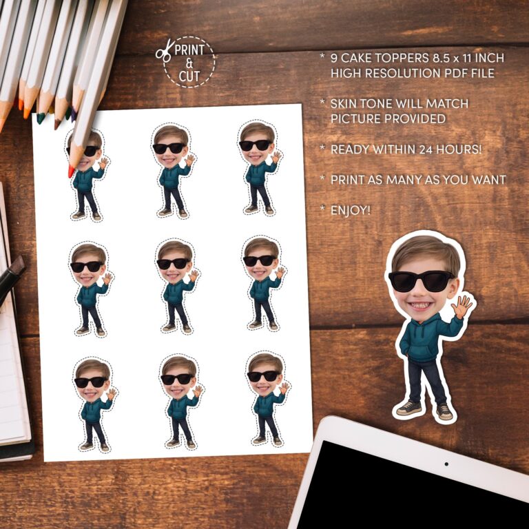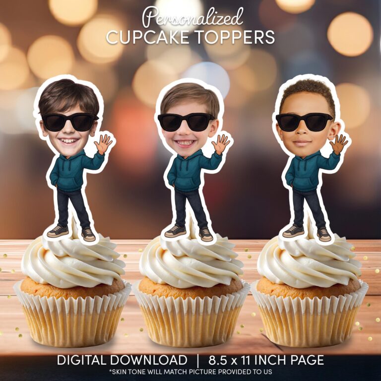 Bring a serious dose of swagger to your dessert table with these personalized face cupcake toppers, featuring a cartoon body decked out in a casual blue hoodie, dark jeans, and stylish black sunglasses. Perfect for energetic school-aged boys, pre-teens, or any "cool dude" themed birthday bash, this design incorporates your guest of honor's photo into a fun, waving stance. We ensure a natural look by adjusting the skin tone of the illustrated hands to match the complexion in the photo you provide. As a high-resolution digital download, this file allows you to print vibrant, high-quality decorations right from home, ensuring your party details are as unique as the birthday boy himself.