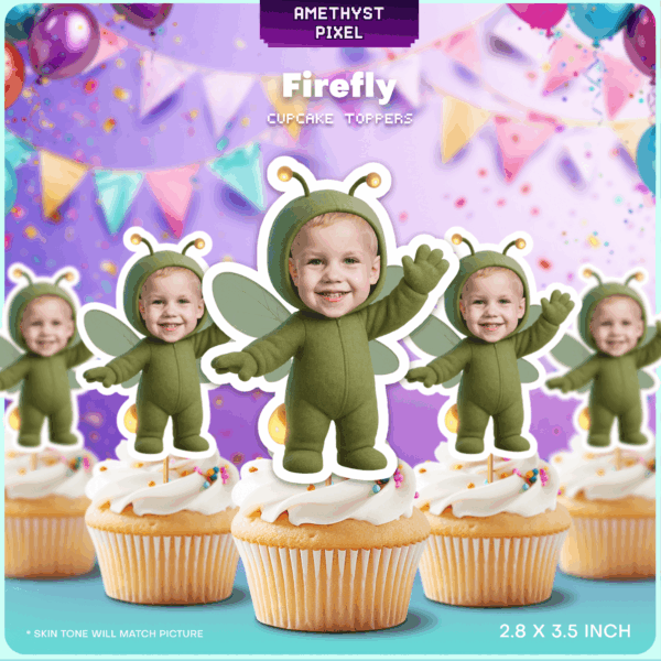Personalized Firefly Face Cupcake Toppers - Printable Lightning Bug Party Decor