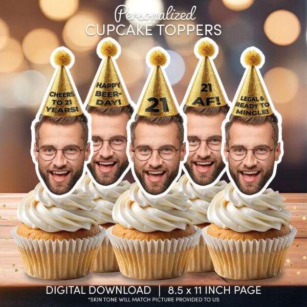 Funny Custom Face 21st Birthday Cupcake Toppers – Gold Glitter Hat Theme for Him