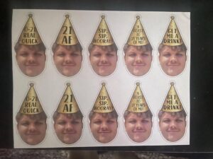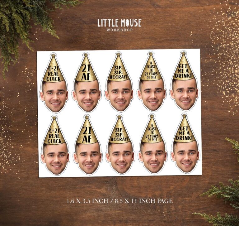 Celebrate the milestone of turning legal with these hilarious personalized 21st birthday face cupcake toppers, designed to bring laughter to any young adult's bash. Featuring a custom cutout of the birthday honoree's face, each topper is adorned with a simulated gold glitter party hat showcasing witty phrases like "21 AF," "Sip, Sip, Hooray!," and "Get Me A Drink!" Drawing on extensive experience in milestone event styling, I recommend these printable decorations for adding a unique, comedic element to dessert tables or bar setups. The high-resolution design ensures that the facial details remain sharp while the bold text stands out in photos, making them an excellent conversation starter for a drinking-themed celebration or a lively night out.