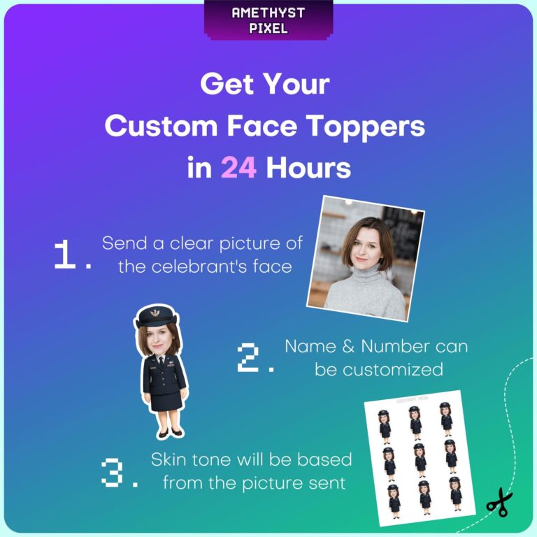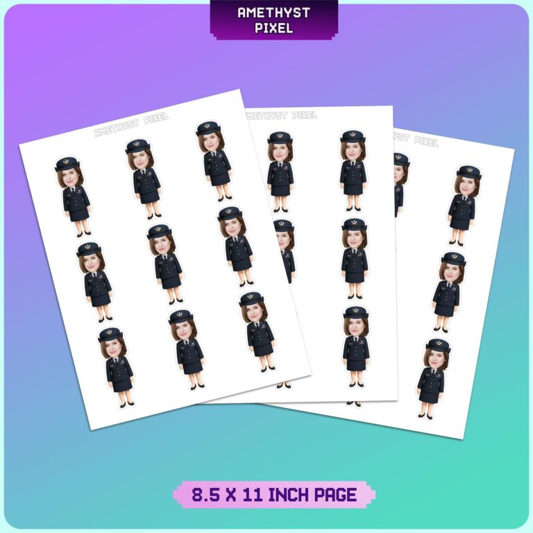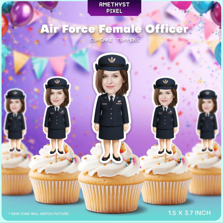 Celebrate the dedication and achievements of the special servicewoman in your life with these professionally designed Air Force female officer cupcake toppers. Expertly illustrated to feature the iconic blue Service Dress uniform, complete with a service cap, regulation tie, and detailed ribbon rack, these decorations provide a respectful yet fun tribute for adult women in the military. Whether you are planning a commissioning ceremony, a much-deserved promotion party, or a sentimental retirement gathering, these printable toppers allow you to attach a custom photo face to a classic military body. This unique decor choice highlights her commitment to the United States Air Force while adding a personalized, memorable element to the dessert table.