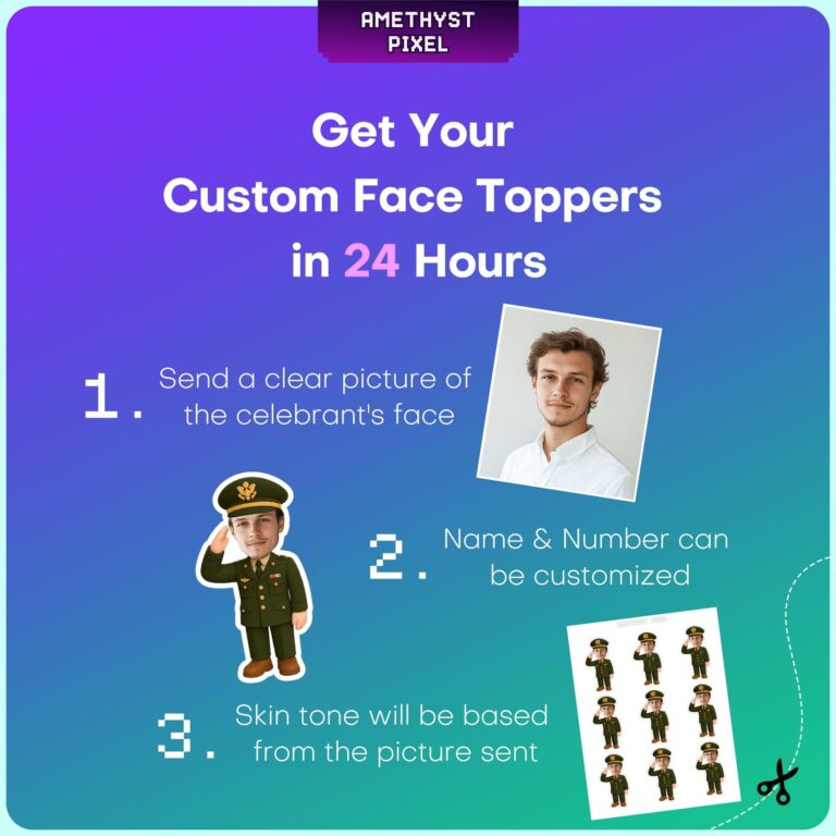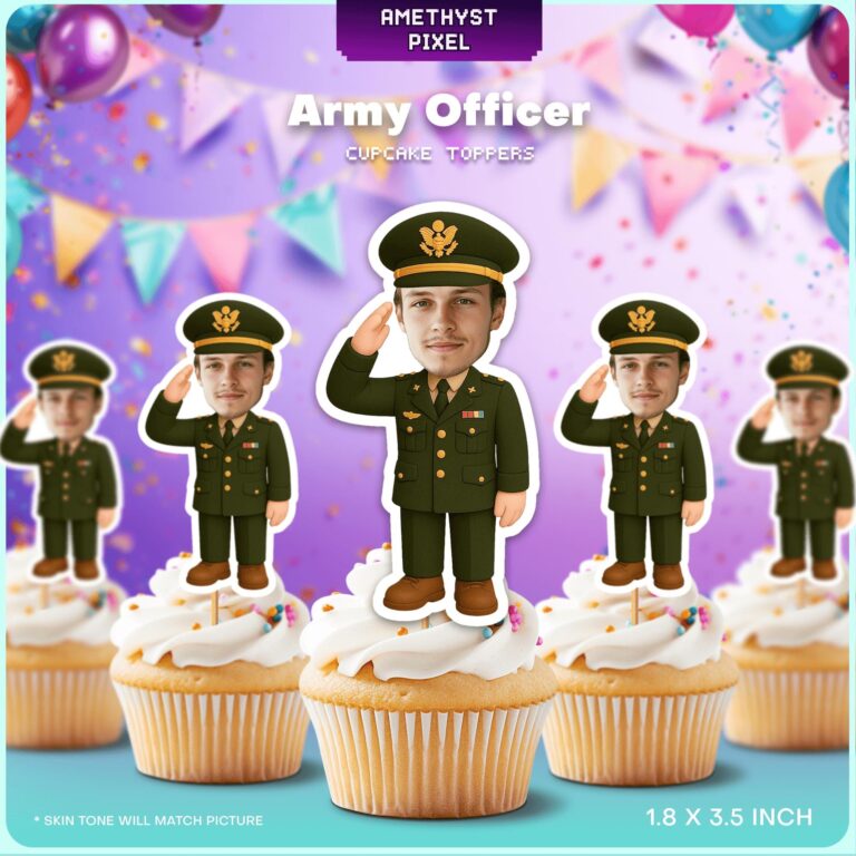Honor the brave servicemember in your life with these custom face Army Officer cupcake toppers, designed to bring a personalized and patriotic flair to any military celebration. Whether you are planning a commissioning ceremony, a promotion party, or a long-awaited homecoming, these printable decorations feature a detailed green dress uniform with gold accents and an officer’s cap, capturing the soldier in a proud salute. We meticulously digitally crop the uploaded photo to fit the character, ensuring the skin tone matches the image provided for a high-quality finish. These toppers serve as an excellent conversation starter and a heartfelt tribute at retirement gatherings or ROTC graduations. By transforming a standard cupcake into a symbol of service, you create a memorable experience that highlights the guest of honor’s professional achievements and dedication.