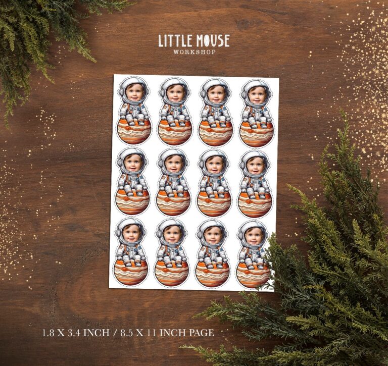 Launch your little one’s big milestone celebration into the stratosphere with our personalized astronaut cupcake toppers, featuring a charming baby explorer resting atop the planet Jupiter. Perfectly suited for a "First Trip Around the Sun" or "Two the Moon" birthday theme, these digital decorations capture the wonder of space travel. We expertly crop your child's photo to fit seamlessly inside the astronaut helmet, ensuring a high-quality, realistic look that delights guests. The design highlights a classic white space suit and the vivid, banded details of the gas giant, making these printable toppers a standout addition to any toddler's galaxy-themed dessert table.