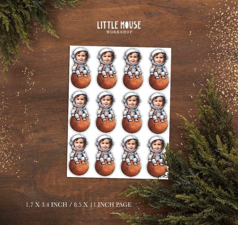 Launch your upcoming celebration into the stratosphere with these personalized astronaut cupcake toppers, expertly crafted to feature your baby’s photo inside a classic space helmet. Seated confidently on a textured red planet that mimics Mars, the little astronaut wears a meticulously designed white space suit complete with mission patches, making this the ultimate accessory for a “First Trip Around the Sun” or “Two the Moon” birthday event. Experienced hosts know that personalized touches create the most impact; these high-resolution DIY printables allow you to maintain control over paper quality while adding a bespoke element to your dessert table. Whether used on muffins or savory appetizers, these custom photo cutouts ensure your space-themed decor feels cohesive, professional, and delightfully unique.