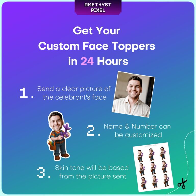 Bring the excitement of the "big top" to your next celebration with these meticulously detailed custom balloon twister cupcake toppers. Designed for those who appreciate the art of entertainment, this printable decoration features a male body wearing classic denim overalls and a bright striped shirt, equipped with a utility pouch full of vibrant modeling balloons. The figure is depicted holding a whimsical purple balloon dog, making this the perfect accessory for carnival-themed birthdays, circus events, or fairground parties. By uploading a clear photo of the birthday boy or guest of honor, you create a personalized focal point that sparks conversation and laughter. These high-quality digital files ensure sharp, vivid colors upon printing, demonstrating a commitment to professional-grade DIY party supplies that elevate your hosting experience. They are easily assembled at home, offering a reliable and creative way to customize your dessert spread with expert flair.