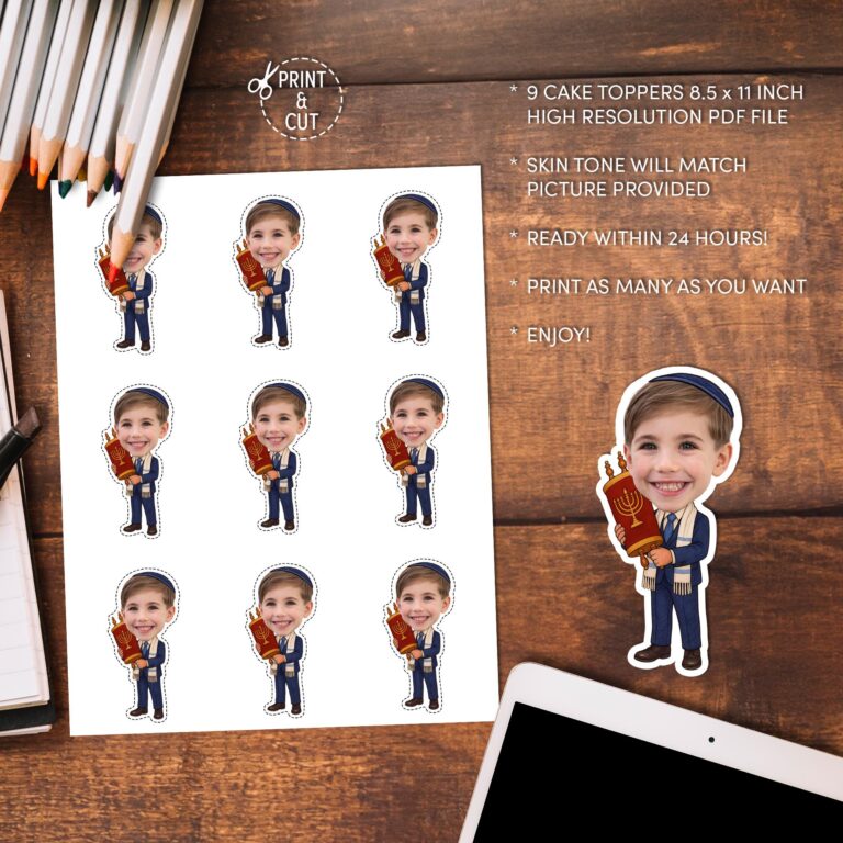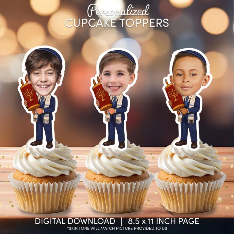 Mark this significant coming-of-age milestone with personalized printable cupcake toppers designed specifically for Bar Mitzvah celebrations. This digital design features a respectful and festive illustration of a young man in a formal blue suit, wearing a traditional tallit (prayer shawl) and kippah, while holding a Torah scroll adorned with a Menorah. Ideally suited for boys celebrating their 13th birthday, these custom photo toppers provide a unique focal point for your event. You will receive a high-resolution file that allows you to print as many copies as needed at home or a local print shop. The result is a memorable, custom decoration that honors tradition while adding a personal touch to the dessert table.