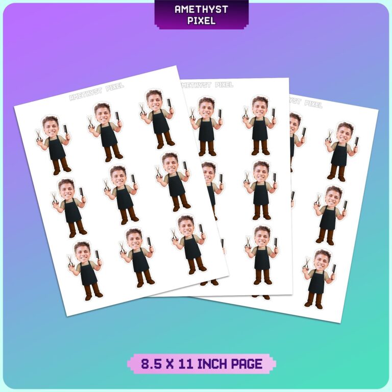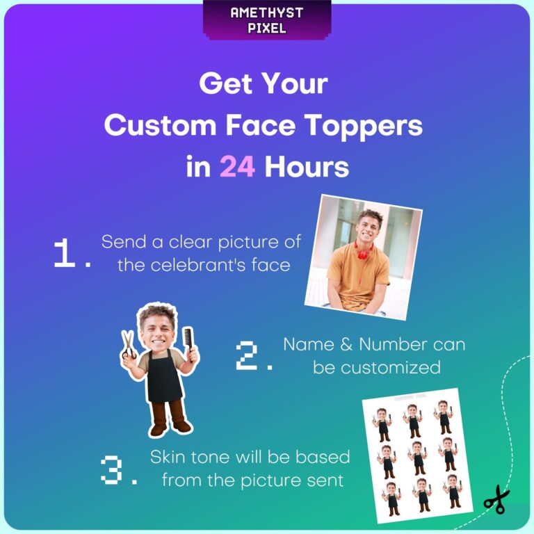 Celebrate the sharpest skills in the business with these professionally designed custom face toppers, tailored specifically for barbers and hair stylists. Perfect for adult birthday parties, salon grand openings, or cosmetology school graduations, this design features a cartoon body outfit consisting of a classic black apron, beige tee, and trade tools including scissors and a styling comb. By seamlessly integrating the guest of honor’s photo, these decorations transform standard desserts into a humorous and personalized tribute to their craft. Measuring approximately 2.1 x 3.5 inches, these printable accents provide a high-quality visual impact that highlights the profession while adding a fun, custom touch to your event setup. Whether for a retirement celebration or a new career milestone, these toppers ensure the dessert table looks a cut above the rest.