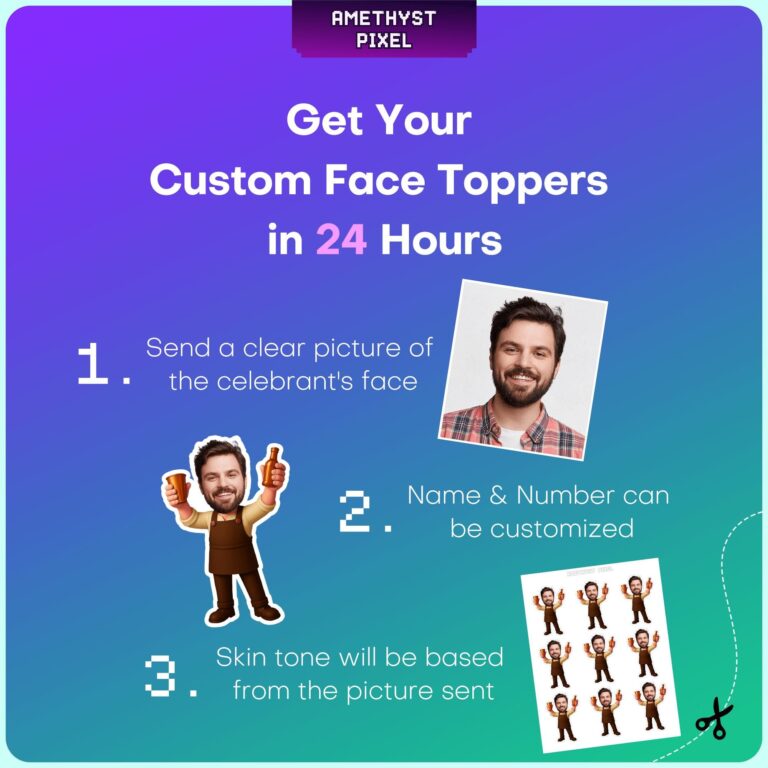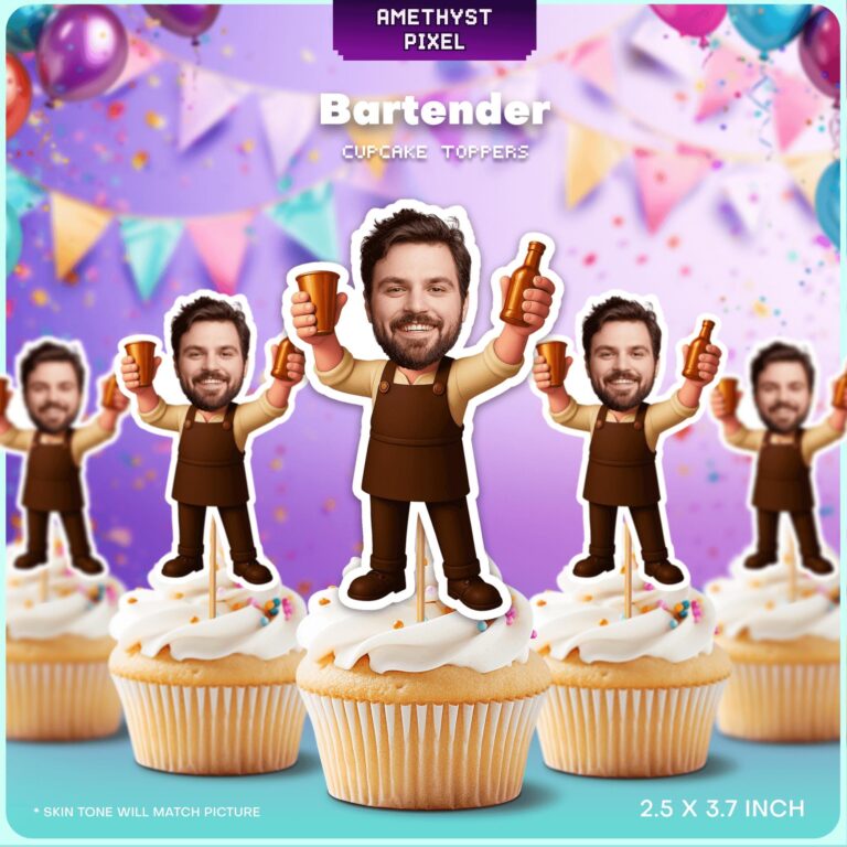 Bring the lively atmosphere of a classic tavern to your next event with these custom face bartender cupcake toppers, designed specifically to enhance adult celebrations. The illustration features a joyous barman attired in a professional brown apron, enthusiastically raising a brown bottle and a serving cup to toast the occasion. Perfect for highlighting the birthday guy or a favorite amateur mixologist, these personalized cake decorations add a layer of humor and distinct character that standard store-bought decor cannot match. Whether you are hosting a backyard beer garden party, a retirement send-off, or a casual cocktail evening, these unique photo cutouts act as both dessert embellishments and engaging icebreakers, ensuring the guest of honor remains the center of attention.