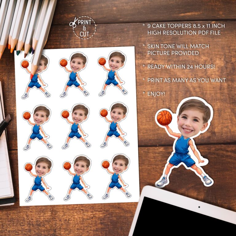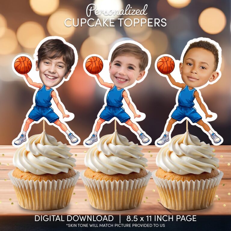 Score big points at your next event with these energetic basketball player cupcake toppers, featuring a custom photo of the guest of honor. Perfect for sports-enthusiast children and basketball-themed birthday parties, this design showcases a player in a blue jersey going for a slam dunk. The cartoon body's skin tone is expertly matched to the photo you provide, creating a seamless and hilarious personalized decoration. As a digital download, you receive a high-quality file ready for printing at home. These toppers add a lively, competitive spirit to any dessert table and offer a memorable way to celebrate your favorite MVP.