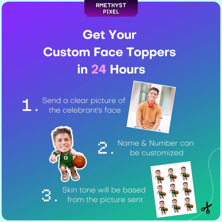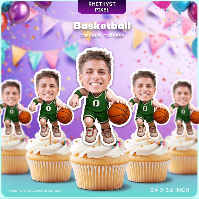 Transform your dessert table into a court-side celebration with these professionally designed custom face basketball cupcake toppers. Featuring a dynamic cartoon body in a classic green jersey and shorts dribbling a basketball, these decorations are perfect for highlighting your favorite player’s passion for the game. Measuring approximately 2.4 x 3.6 inches, they offer substantial visual impact for standard cupcakes, brownies, or savory party snacks. Ideal for teen athletes, dedicated fans, and coaches, this personalized party decor ensures the guest of honor is the clear MVP of the event. We carefully edit your uploaded photo to match the skin tone of the cartoon physique, delivering a seamless and high-quality finish that brings humor and team spirit to end-of-season banquets, birthday parties, or game day gatherings.