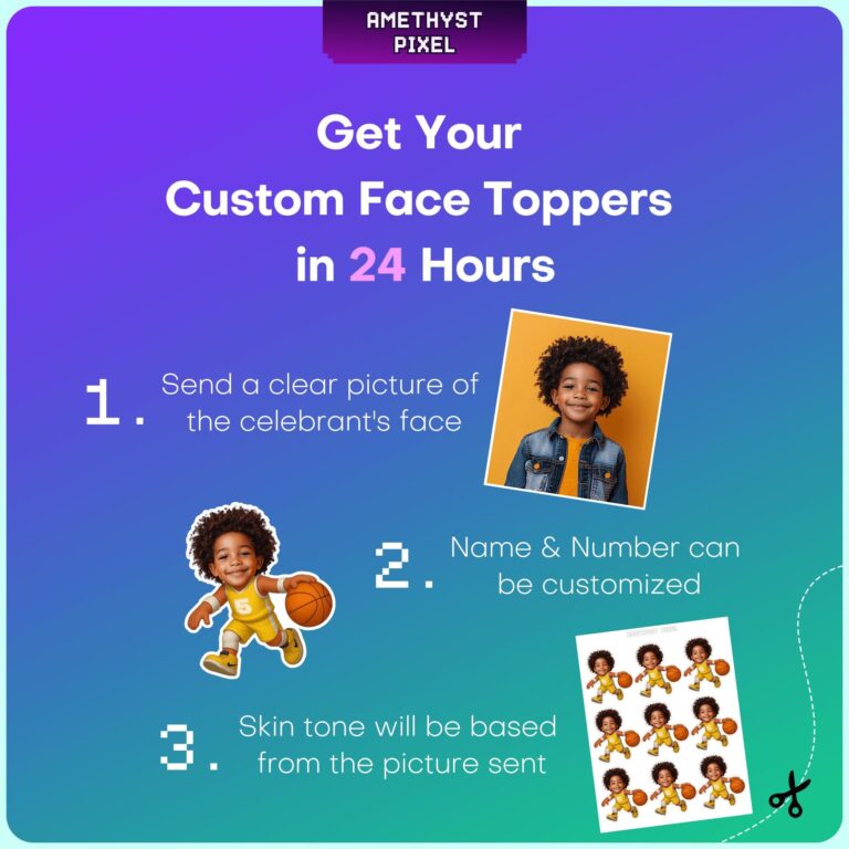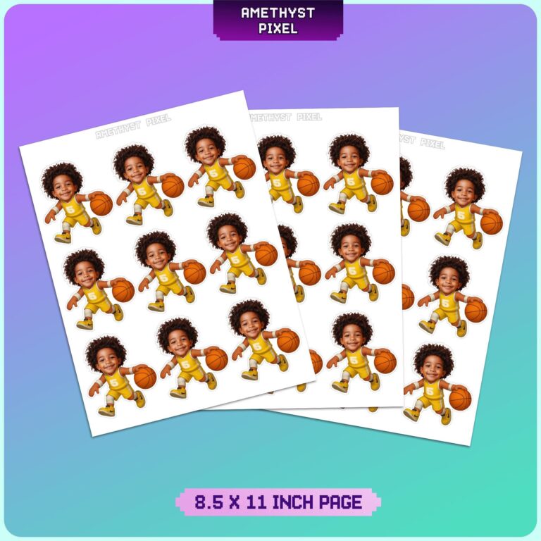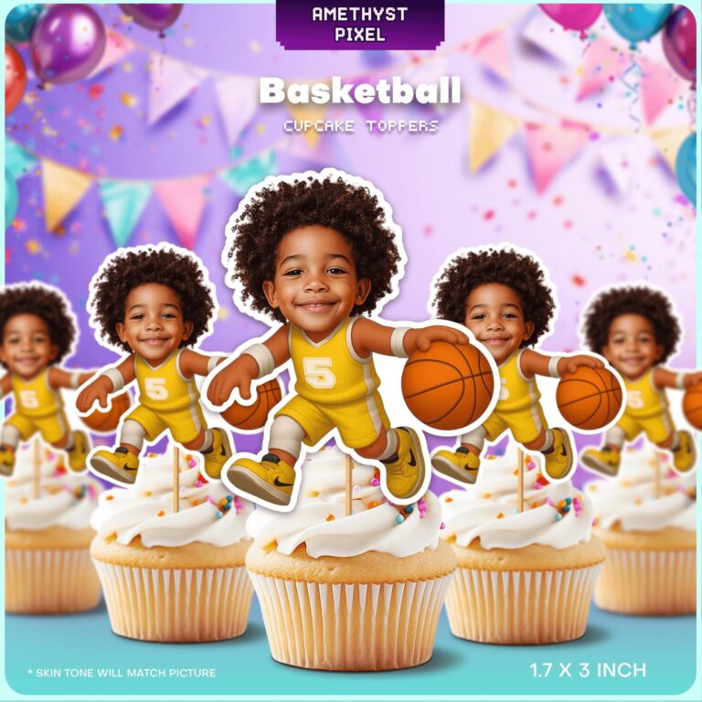 Elevate your courtside celebration with these dynamic custom face basketball cupcake toppers, designed to turn your little MVP into the star of the game. Featuring a high-energy cartoon body clad in a bright yellow jersey with the number 5, this printable design captures the excitement of dribbling down the court. Perfectly sized at 1.7 by 3 inches, these decorations are ideal for standard cupcakes, ensuring they stand out without overwhelming the dessert. Whether you are planning a fifth birthday bash or searching for unique team spirit decorations, these personalized photo toppers add a humorous and heartwarming touch to your event. The expert integration of your child's photo creates a memorable focal point for your dessert table, ensuring high-quality visual appeal for party guests of all ages.