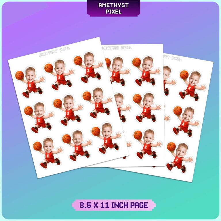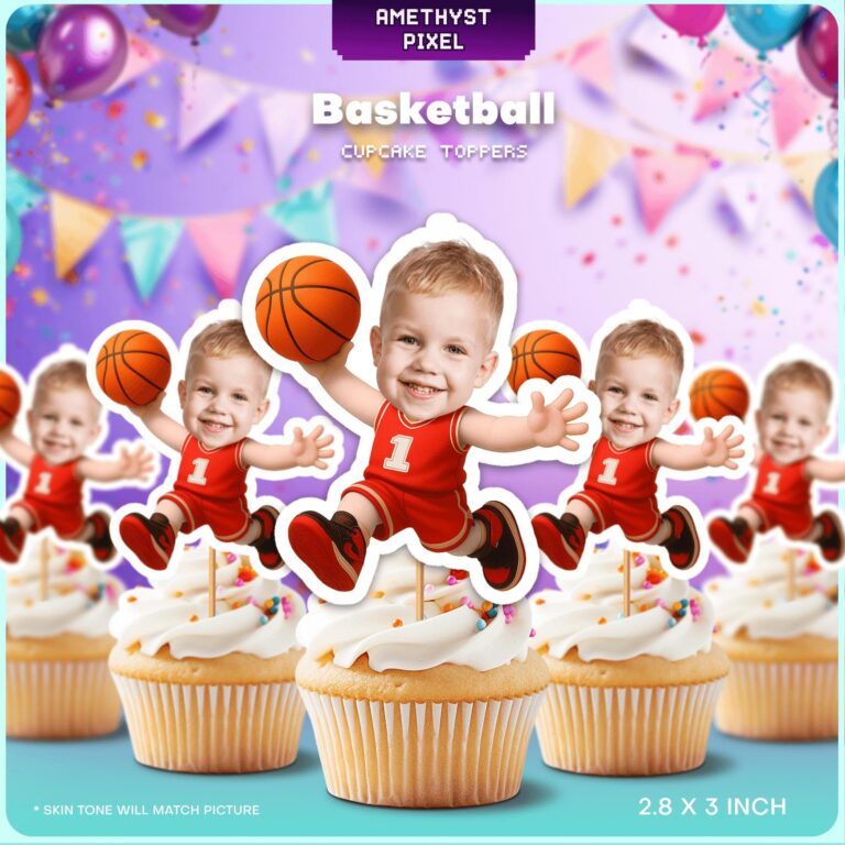 Transform your little one into the star athlete of the celebration with these custom face basketball cupcake toppers. Designed specifically for sports-themed events and "Rookie of the Year" milestones, this high-energy design features a toddler-sized body in a vibrant red uniform, sporting the number one on the jersey while executing a dynamic jump shot with a classic orange basketball. Ideal for parents seeking a unique, humorous, and heartwarming addition to a dessert table, these printable decorations offer a high-resolution finish that captures every detail from the sneakers to the jersey texture. Simply print, cut, and assemble to bring the excitement of the court to your child’s birthday, ensuring a memorable and photogenic focal point for your party treats.