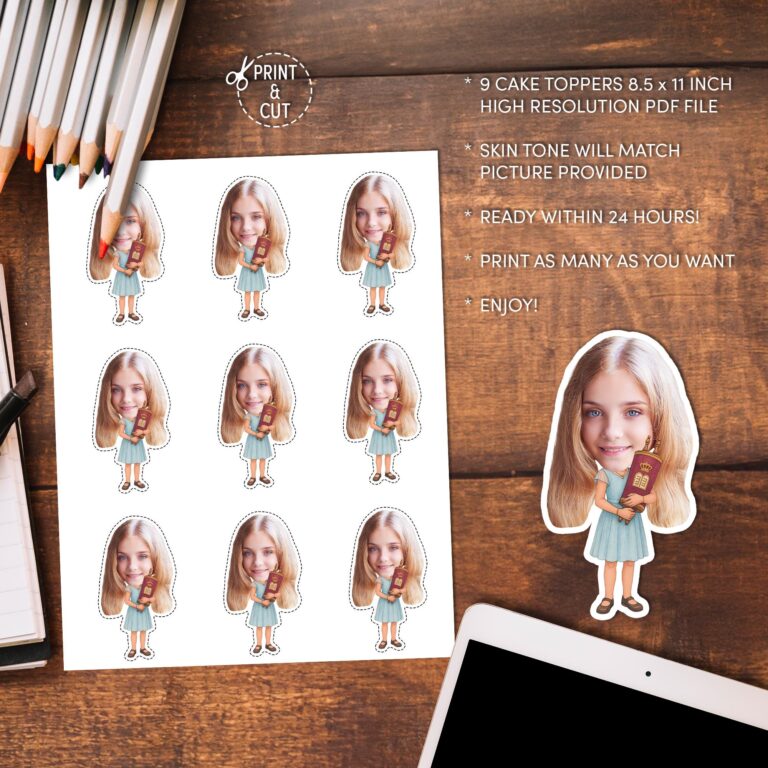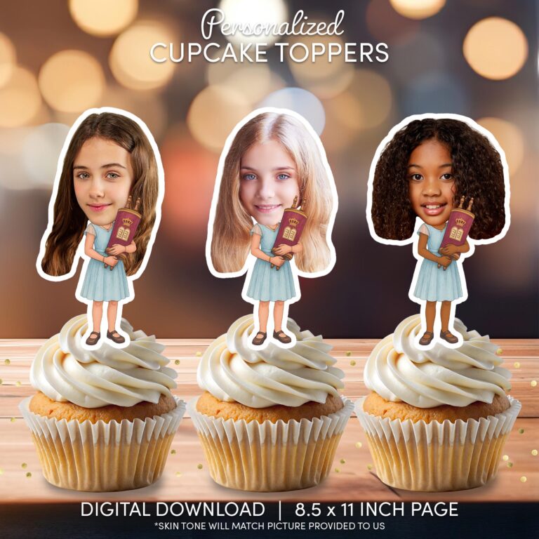 Celebrate this significant coming-of-age milestone with truly unique printable cupcake toppers featuring the Bat Mitzvah girl's face. This digital download offers a whimsical yet respectful design of a young girl in a blue dress holding a Torah scroll, perfect for religious celebrations. The illustration is expertly customized to feature your provided photo, with the skin tone of the character adjusted to match the subject for a seamless look. Ideal for pre-teen girls celebrating their 12th or 13th birthday, these DIY toppers add a personal and memorable touch to the dessert table or Kiddush luncheon. Simply upload a clear photo, print the high-resolution file at home, and assemble to create a festive atmosphere that honors her special day.