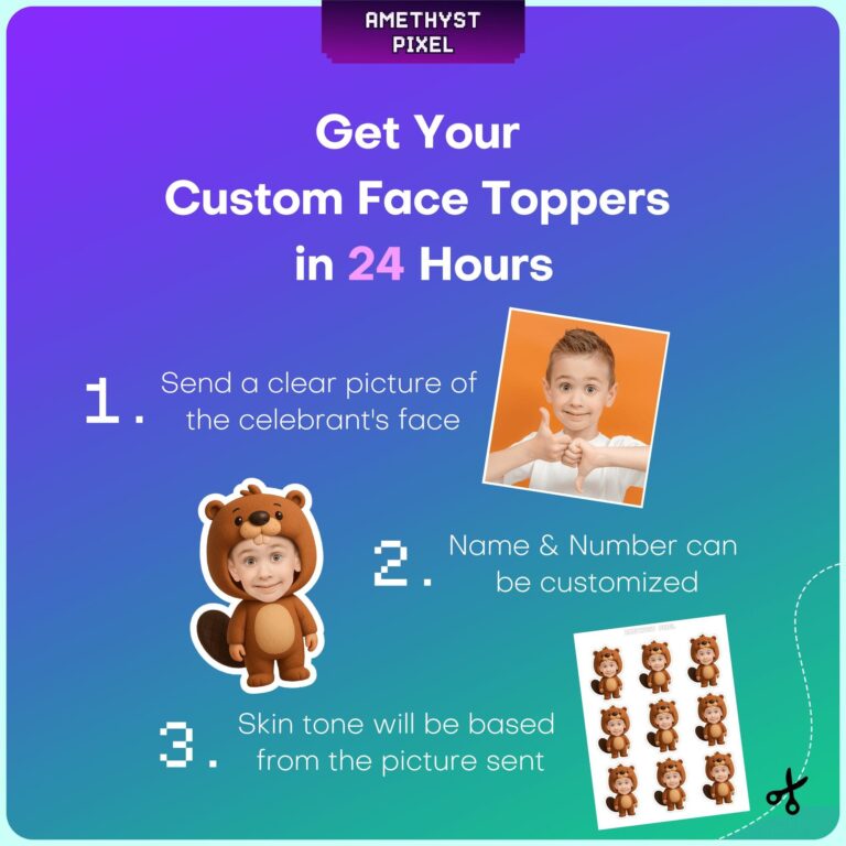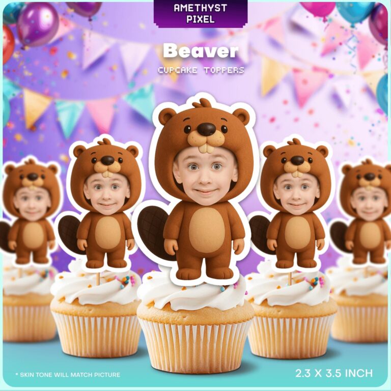 Transform your dessert table into a forest adventure with these adorable custom face beaver cupcake toppers, designed specifically for woodland-themed birthdays and nature-inspired celebrations. Featuring a charming brown beaver body with signature buck teeth and a cross-hatched flat tail, this design allows you to showcase your child's smiling face inside a cozy animal hood. Ideal for toddlers and young children, these 2.3 x 3.5-inch decorations offer a professionally crafted look that brings humor and personality to standard cupcakes. As an expert choice for DIY party planners, these printable cutouts ensure high-resolution quality and easy assembly, making them the perfect centerpiece for camping parties or wildlife events.