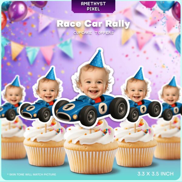 Bespoke Blue Race Car Photo Cupcake Toppers for First Birthday Celebrations
