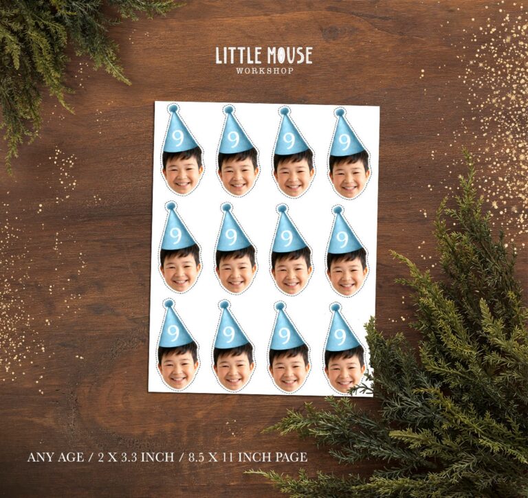 Transform a standard dessert table into a memorable celebration showcase with these custom face cupcake toppers, featuring a classic blue party hat design that is fully personalized for your child's big day. Specifically illustrated here for a 9th birthday, the topper design includes a festive blue cone hat with a white text number and a pom-pom detail, perfectly framing the birthday boy's smiling face. These printable decorations measure approximately 2 by 3.3 inches, a size expertly chosen to ensure visibility on frosted cupcakes without causing them to tip over. Ideal for parents seeking a cohesive blue color scheme, these unique photo cutouts offer a high-quality, professional aesthetic that is easy to assemble at home. Whether for a small family gathering or a large class party, these personalized toppers add a layer of warmth and humor that standard store-bought decorations simply cannot match.