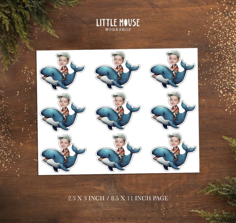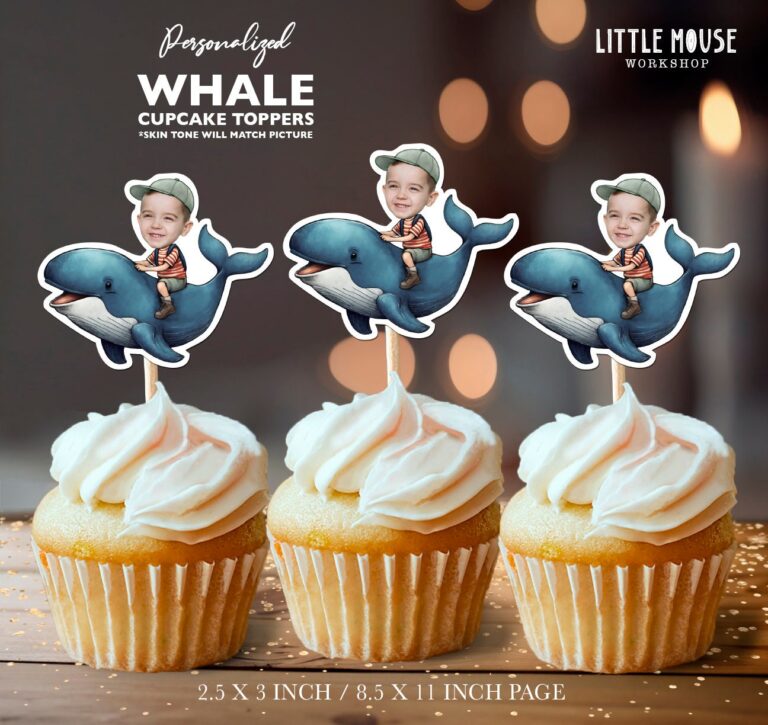 Transform your dessert table into an oceanic delight with these personalized whale cupcake toppers, specifically designed to feature your little one riding the waves. The high-quality illustration depicts a playful blue whale carrying a child dressed in a classic striped tee and green cap, creating a heartwarming aesthetic perfect for any nautical or 'Under the Sea' birthday party. By incorporating your child's actual photo, these custom face decorations add a layer of warmth and exclusivity to the event, ensuring the birthday boy is truly the star of the show. Ideal for toddlers and young children, these printable toppers utilize high-resolution imagery to ensure a crisp, vibrant look when printed, making your DIY party planning both personal and professional.
