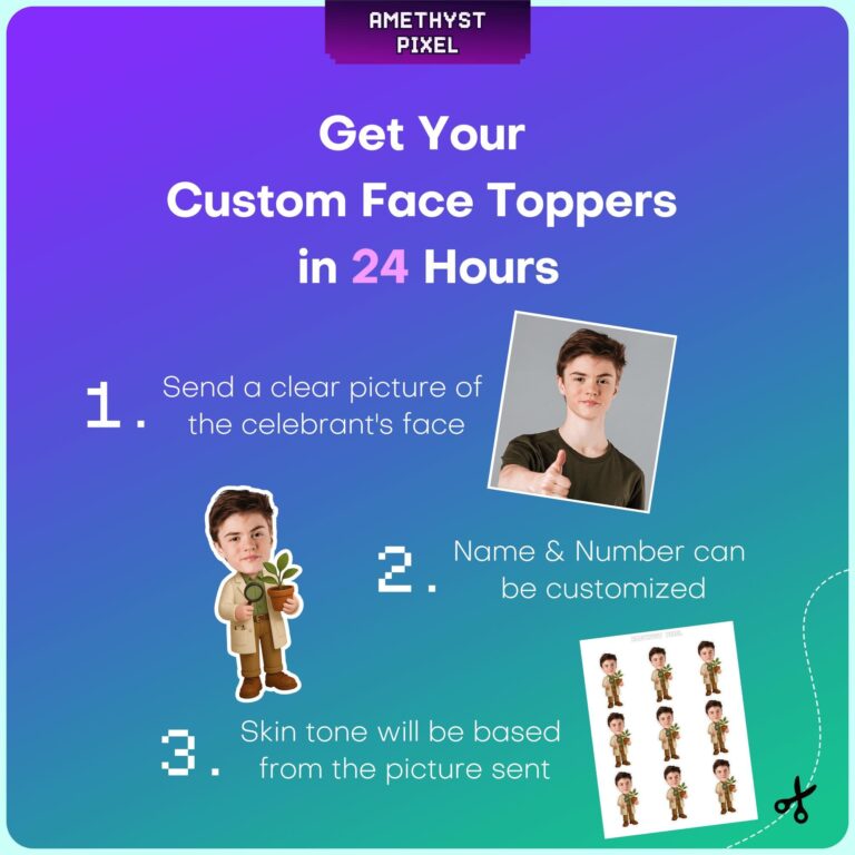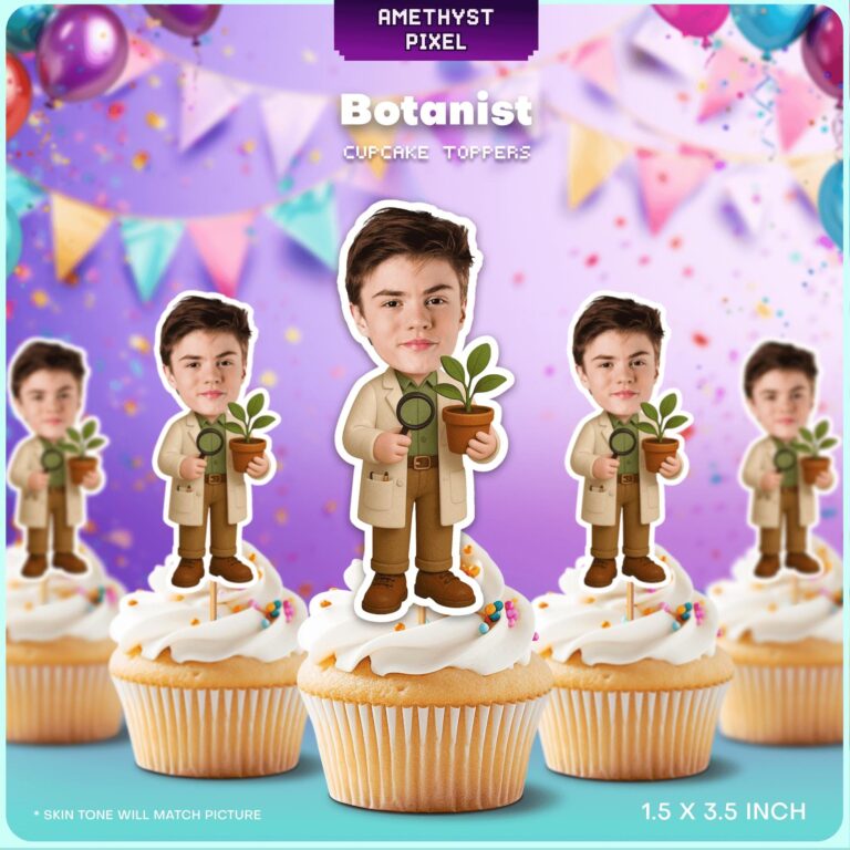 Celebrate your burgeoning biologist's special day with these professionally designed custom face botanist cupcake toppers, tailored specifically for children who love exploring the natural world. Each topper features a detailed illustration of a young field researcher dressed in a beige lab coat and sturdy brown boots, holding a magnifying glass in one hand and a potted seedling in the other to symbolize growth and discovery. Ideal for pre-teens and school-aged children with a passion for STEM, these personalized decorations add a layer of expertise and charm to any garden-themed birthday or science event. By integrating your child’s photo onto this studious character, you create a unique focal point for your dessert table that accurately reflects their hobbies. These high-quality printable toppers are perfect for crowning cupcakes, muffins, or even themed 'dirt cups', ensuring your party decor is as educational as it is festive.