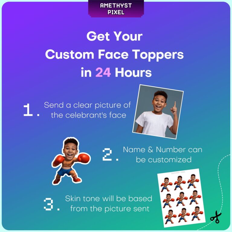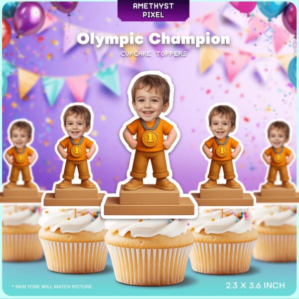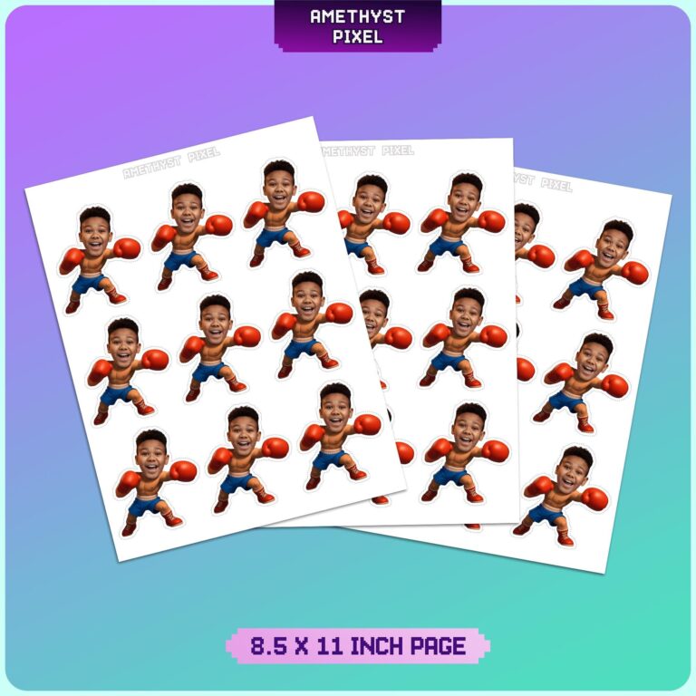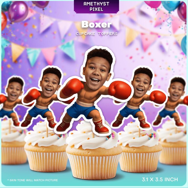 Turn your child into the main event of their celebration with these high-energy custom face boxing cupcake toppers, designed specifically for sports-loving kids. This dynamic design features a cartoon boxer body in mid-punch, outfitted in classic blue trunks, bright red boxing gloves, and matching athletic boots, creating an action-packed visual for your dessert table. Measuring approximately 3.1 x 3.5 inches, each topper is expertly personalized by expertly blending your uploaded photo with the character body, ensuring the skin tone matches perfectly for a seamless, professional finish. Ideal for energetic boys and aspiring athletes, these printable decorations serve as a hilarious and memorable focal point, guaranteeing the birthday VIP feels like the undisputed heavyweight champion of the party.