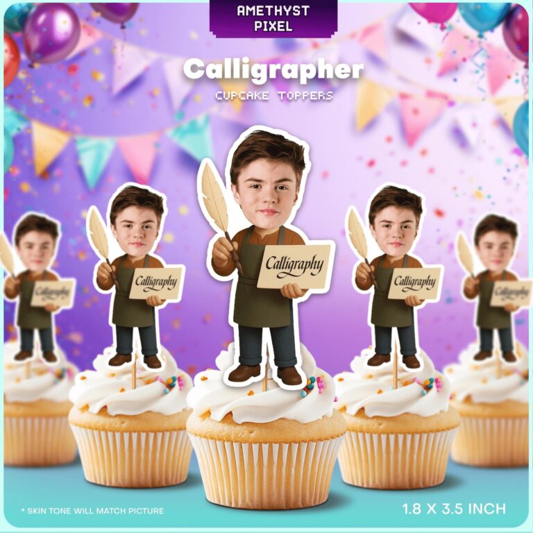 Celebrate the elegance of handwriting and the joy of creation with these distinct Calligrapher-themed cupcake toppers, perfect for the aspiring artist in your life. Designed for children and creative students who possess a passion for the written word, these personalized decorations feature your subject’s face seamlessly integrated onto a cartoon artist’s body. The illustration includes authentic details such as a professional green apron, an oversized feather quill pen, and a parchment sign labeled 'Calligraphy.' Ideal for art-themed birthday parties or creative workshop celebrations, these digital printable files facilitate a stress-free DIY experience. The high-resolution imagery ensures that the fine details of the writing tools stand out on your dessert table, providing a sophisticated yet fun focal point for your event.