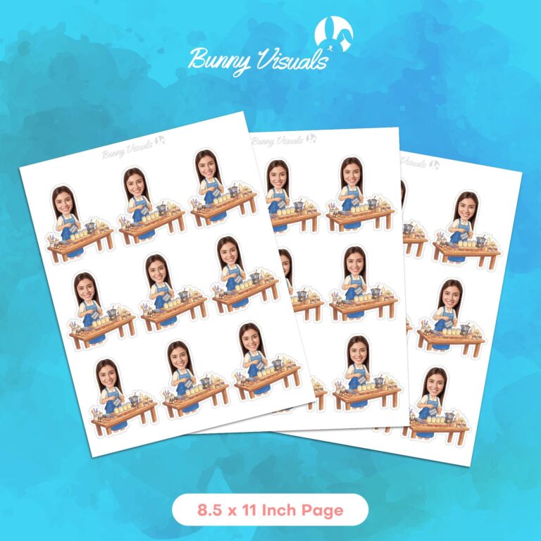 Celebrate the art of chandlery with these professionally designed printable cupcake toppers, featuring a custom photo of your favorite candle maker. Specifically tailored for adult crafters and DIY enthusiasts, this detailed design depicts a realistic workstation complete with a melting pot, essential oil bottles, dried lavender, and jars of fresh wax. The character is styled in a blue artisan apron, actively pouring a batch, capturing the essence of a handmade business or serious hobby. Ideally sized for a 3.2 x 3.5 inch cutout, these personalized decorations provide a sophisticated yet fun focal point for business launches, craft workshops, or birthday celebrations dedicated to the creative maker in your life.