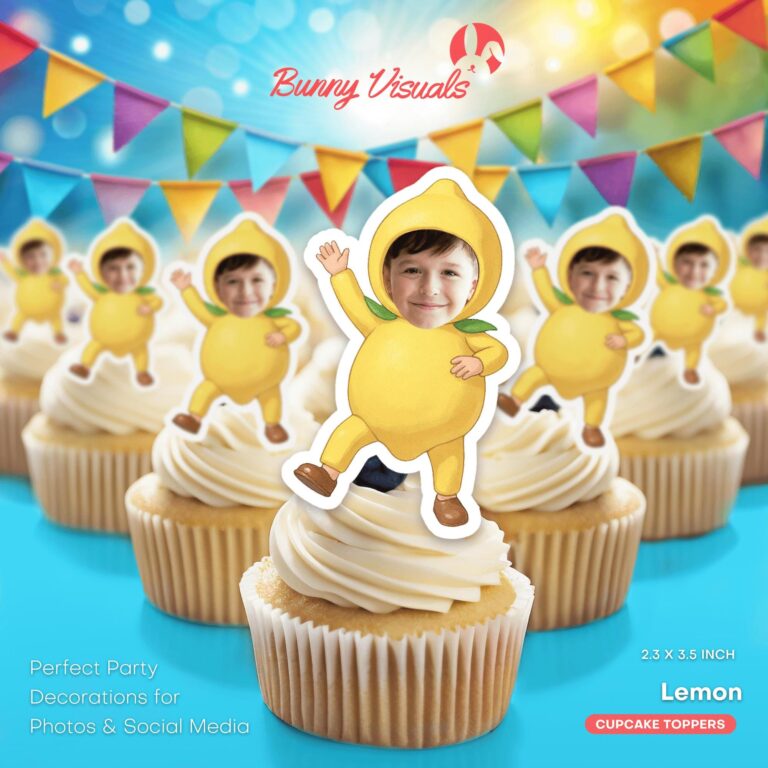 Infuse your next event with sunshine and laughter using these custom face lemon cupcake toppers, designed to turn your child into the zestiest guest of honor. Perfect for toddlers and young children, this design features a vibrant yellow lemon body costume complete with walking legs across a cupcake, a leafy green collar, and your main squeeze's smiling face front and center. Expertly crafted for "One in a Melon" or "Main Squeeze" birthday themes, these personalized decorations add a unique, humorous element to dessert tables that standard store-bought decor cannot match. Whether you are hosting a backyard lemonade stand party or a bright tutti-frutti summer bash, these high-resolution toppers serve as excellent photo props and conversation starters. The 2.3 x 3.5-inch size is optimized to sit securely on standard frosted cupcakes, ensuring a professional and festive look for your social media memories.