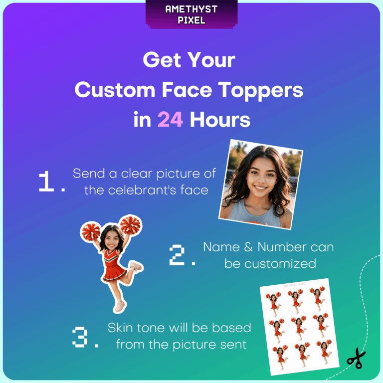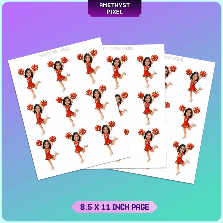 Elevate your team spirit or birthday celebration with these energetic custom face cheerleader cupcake toppers. Ideally suited for children, pre-teens, and teens passionate about cheerleading, this digital download transforms your provided photo into a fun, personalized decoration featuring a classic red uniform and pom-poms in a dynamic jumping pose. As an experienced designer, I ensure the skin tone is adjusted to match your picture for a natural and cohesive look. These printable files are perfect for cost-effective DIY party planning—simply print the high-resolution file at home, cut around the outline, and attach to picks to create standout treats. Whether celebrating a big competition win, a senior night, or a themed birthday bash, these photo-based toppers add a high-quality, spirited element to your dessert presentation.