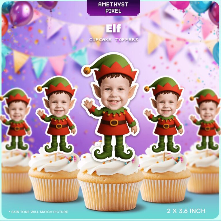 Bring the magic of the North Pole to your dessert spread with these expertly designed custom face Christmas elf cupcake toppers. Featuring a classic holiday palette of red and green, this adorable design showcases your child’s photo on a waving elf body, dressed in a festive tunic with a jingle bell hat and curled shoes. Perfect for winter celebrations and family gatherings, these toppers act as a unique conversation starter that personalizes your event decor. Whether you are hosting a classroom party or a cozy Christmas Eve dinner, this printable decoration ensures high-resolution quality and easy assembly. Simply upload a clear photo to create a fun, memorable addition to your holiday baking that delights guests of all ages.