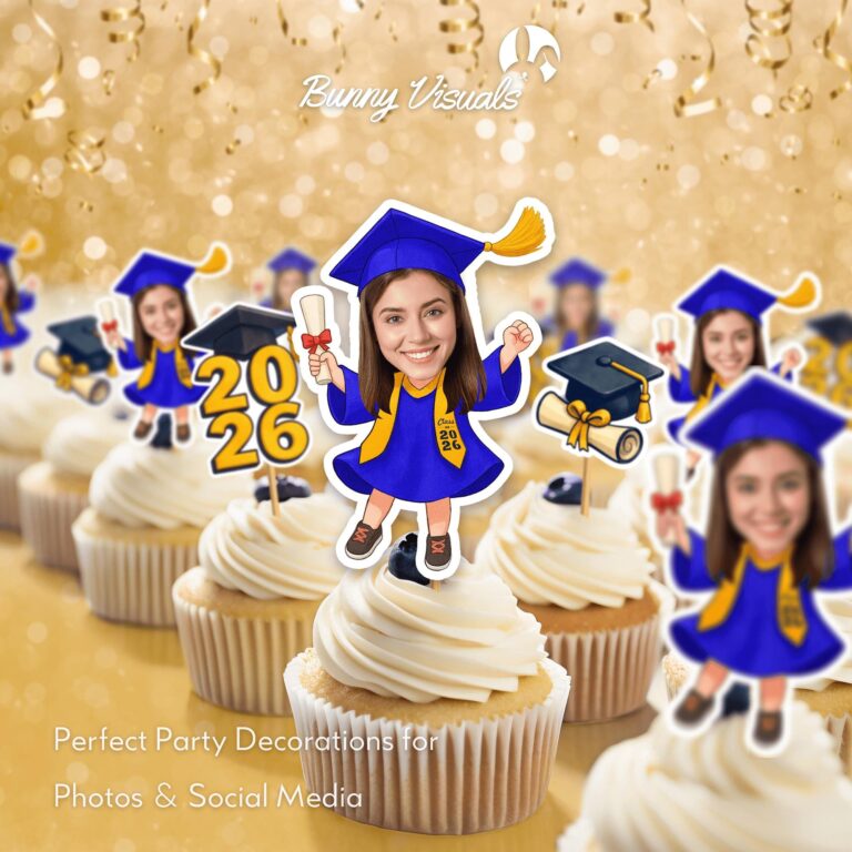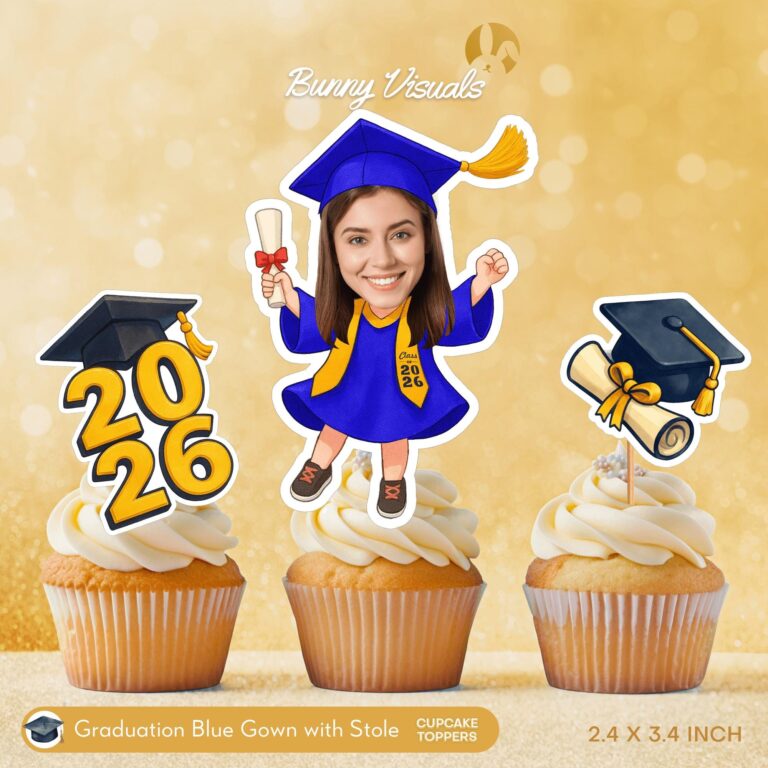 Celebrate the monumental academic achievements of the Class of 2026 with these professionally designed custom face cupcake toppers, featuring a spirited graduate in a royal blue cap and gown. Specifically tailored for high school and college commencements, each topper showcases your graduate's photo on a cartoon body that is joyfully holding a diploma and wearing a sash marked with the graduation year. These personalized decorations add a unique layer of sentiment and fun to dessert tables, ensuring the guest of honor is recognized in every detail of the event. Perfect for open houses and family gatherings, these high-quality toppers serve as memorable keepsakes and engaging photo props that elevate the atmosphere of any graduation party.