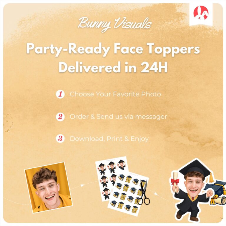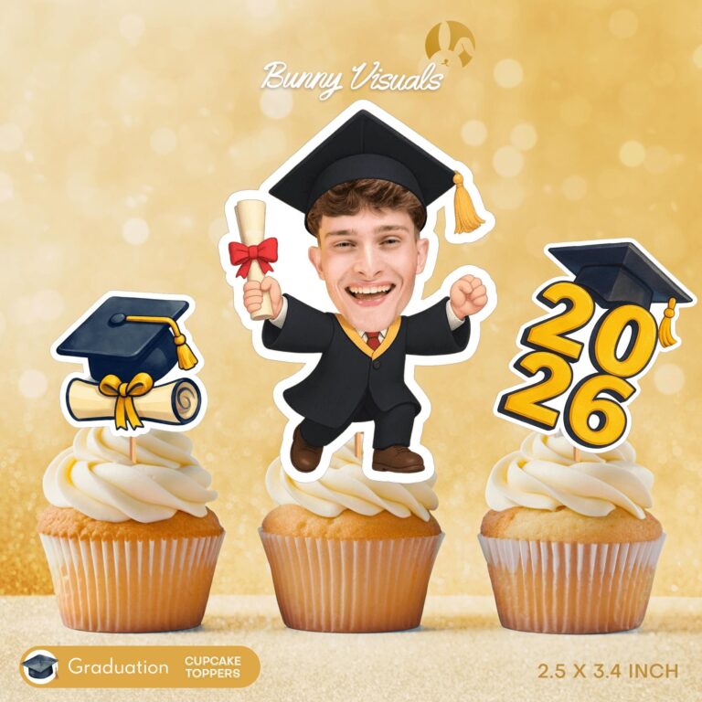 Commemorate the academic achievements of the Class of 2026 with these professionally designed custom face graduation cupcake toppers. Perfectly suited for high school seniors or college graduates, this personalized party decor features your graduate’s photo seamlessly blended with a festive cartoon body wearing a classic black cap and gown. The design includes a rolled diploma with a red ribbon and a prominent "2026" graphic, marking the specific year of accomplishment. As a digital printable product, these toppers offer a convenient and high-quality solution for adding a bespoke element to graduation open houses or family dinner celebrations. This unique touch transforms standard cupcakes into a centerpiece worthy of the graduate's hard work and dedication, ensuring the event is memorable.
