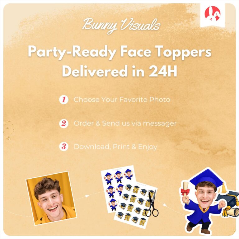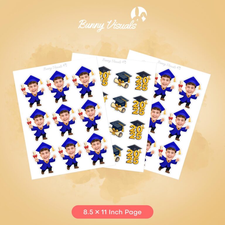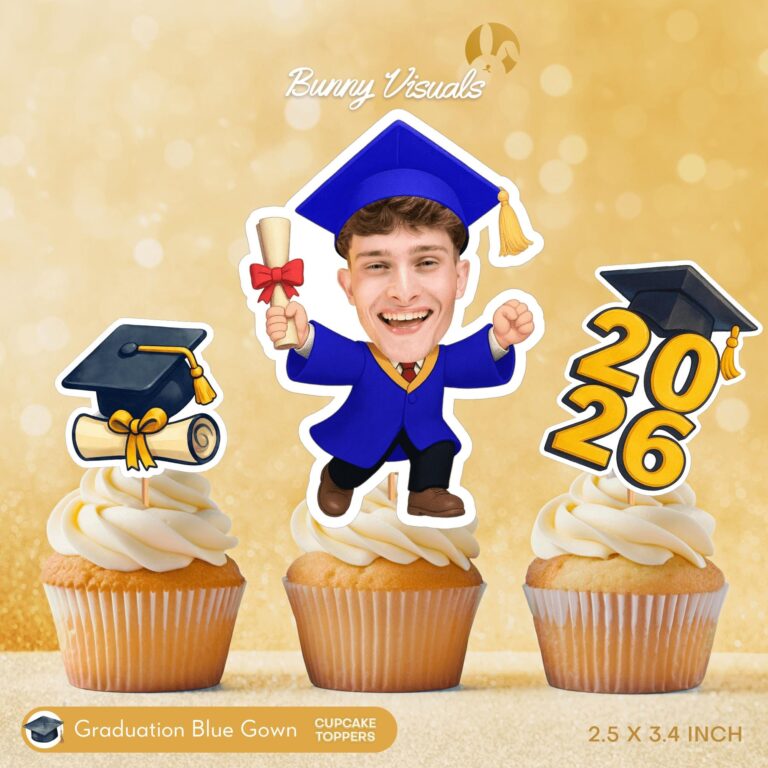 Celebrate a significant academic milestone with these professionally designed custom face graduation cupcake toppers, specifically tailored for the Class of 2026. This unique party decoration features a vibrant blue mortarboard cap and gown design, complete with a gold tassel and a rolled diploma, perfectly capturing the spirit of commencement. Whether you are honoring a high school senior or a college graduate, these printable cutouts transform a standard photo into a lively, celebratory cartoon figure that adds personality to any dessert table. Ideal for graduation open houses and family dinners, these DIY toppers provide a high-quality, photogenic element that encourages social sharing and creates lasting memories. The digital format ensures you can print as many as needed for large gatherings, ensuring a cohesive and festive atmosphere.