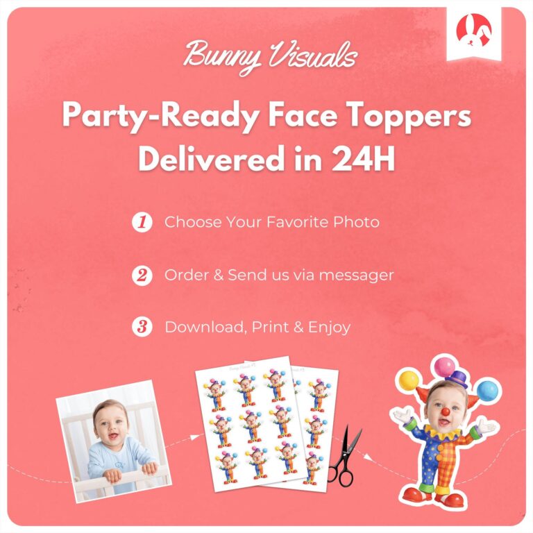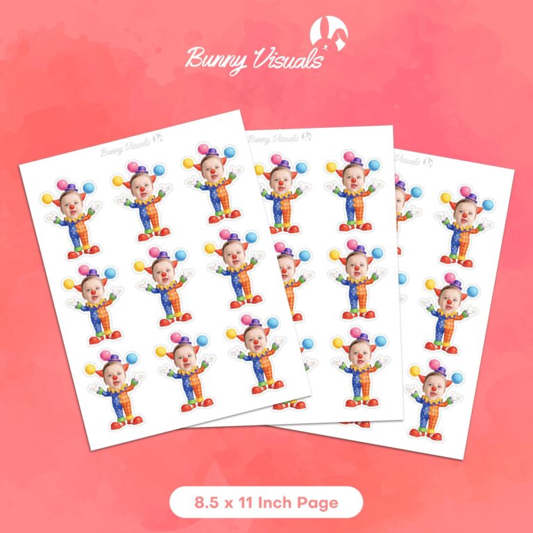 Transform your little one into the star of the show with these vibrant custom face cupcake toppers, perfect for a circus or carnival-themed birthday bash. Specifically designed for babies and toddlers, this digital design seamlessly superimposes your child's photo onto a whimsical clown body featuring a blue polka-dot and orange plaid suit. The cheerful character is accessorized with a festive balloon hat, oversized red shoes, and a digitally added red nose to complete the authentic circus look. Sized at approximately 2.5 x 3.5 inches, these printable decorations offer high-resolution detail that ensures your party treats look professional and fun. Whether you are hosting a “Big Top” first birthday or a general carnival event, these personalized cutouts add a humorous and heartwarming touch that guests will love.