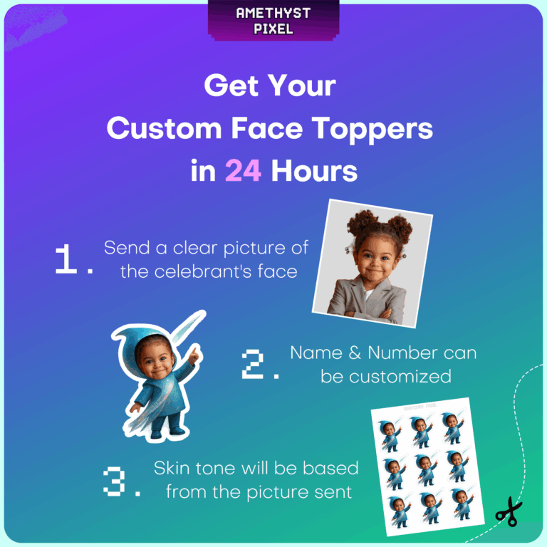 Make your little one the star of the show with these adorable custom face Comet Buddy cupcake toppers. Ideal for a "First Trip Around the Sun" or galaxy-themed celebration, this digital design features your child's photo professionally superimposed onto a whimsical blue outfit complete with a sparkling comet-tail hood and starry sash. The artwork mimics a glitter texture for a festive look without the actual mess, ensuring vibrant results when printed at home or a local shop. This DIY printable file allows you to create as many toppers as you need to make your dessert table truly out of this world.