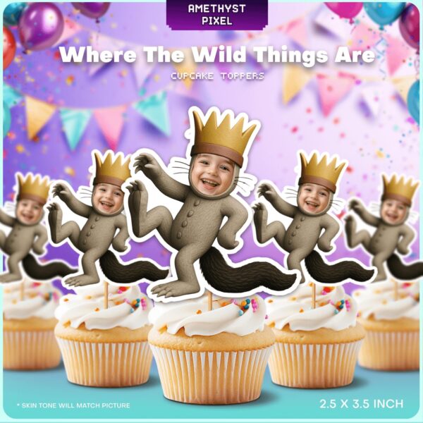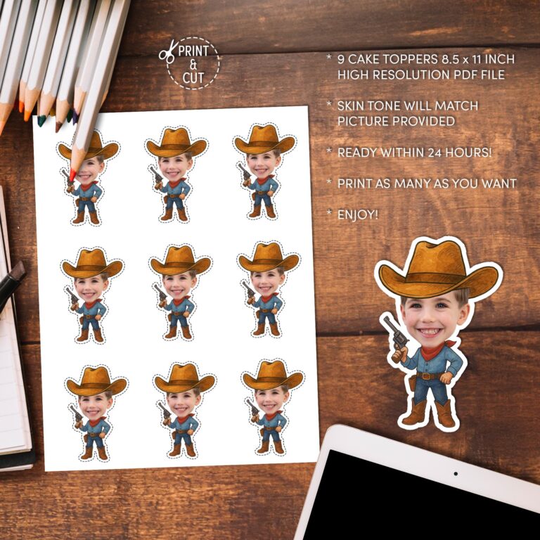 Saddle up for a memorable celebration with these personalized cowboy cupcake toppers, designed to transform your child into the star of the Wild West. This digital download features a detailed western illustration complete with a classic brown rancher hat, red bandana, denim outfit, cowboy boots, and a prop revolver. Simply provide a high-quality photo, and the design is customized to feature your little one's face, with skin tones adjusted to match the picture provided as shown in the examples. Ideal for toddlers and young children celebrating a 'My First Rodeo' or western-themed birthday, these printable decorations add a fun, cohesive look to your dessert table that guests will love.