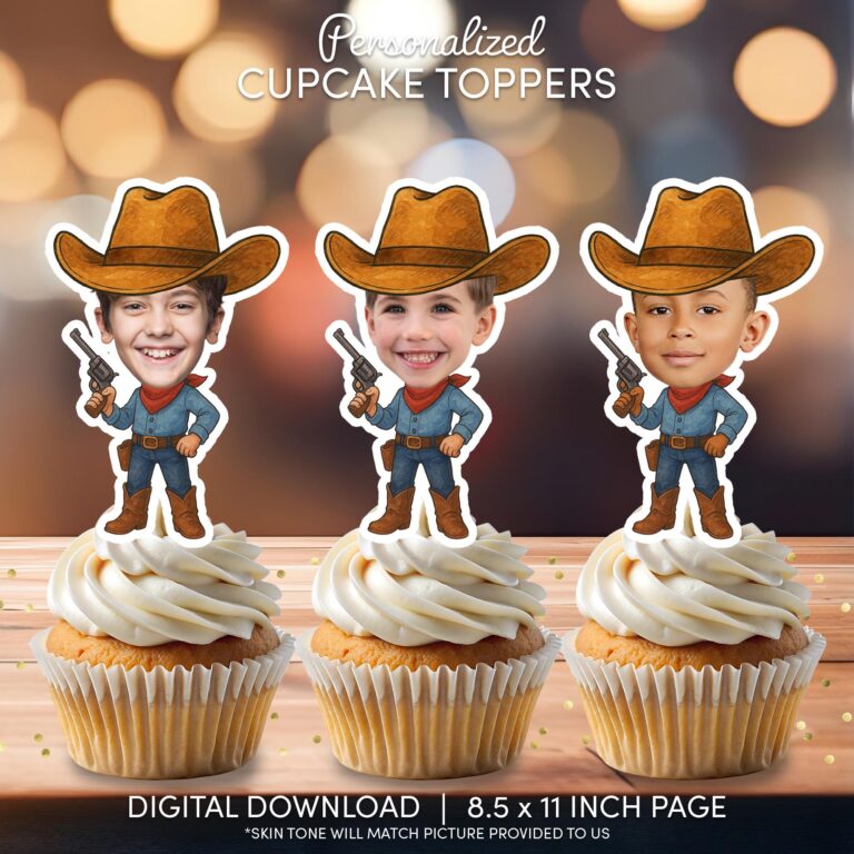Custom Face Cowboy Cupcake Toppers Printable Wild West Birthday Party Decoration