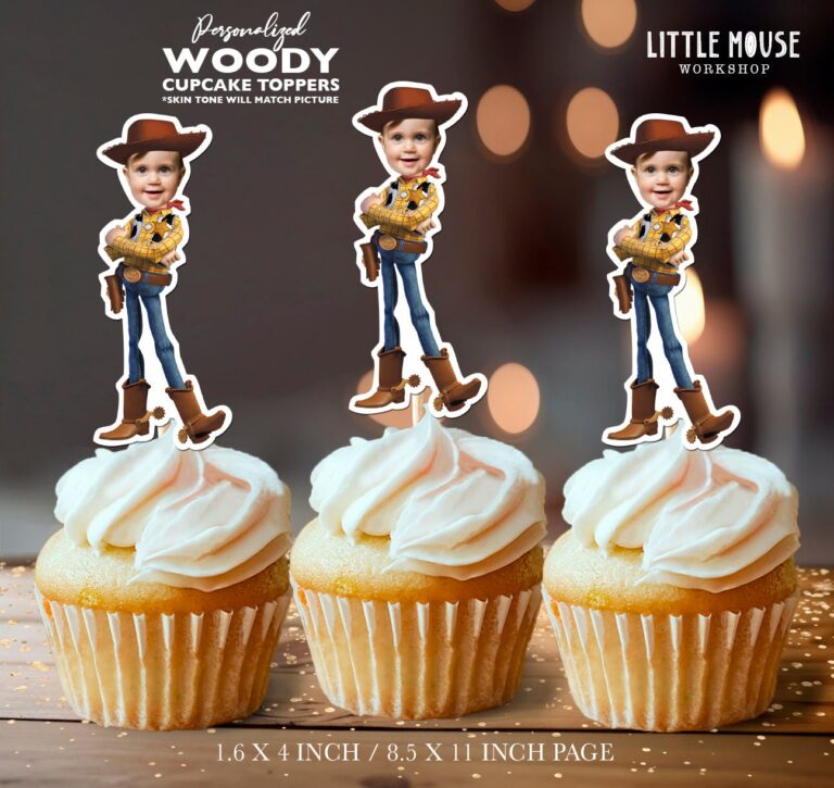 Custom Face Cowboy Woody Theme Cupcake Toppers – Personalized Western Birthday Décor